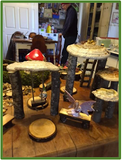 I began the process by applying Mod Podge® to all the pieces to seal them and give them a glossy finish. My husband helped me cut stepping stones and ladder rungs. We devised a seesaw and a swing hung from a fungus canopy. He cut pieces for a table, chairs, and benches. As my friends commented, “It’s enchanted.” I couldn’t help playing, arranging pieces and rearranging them. Oh my word, had I had a village like this as a little girl, I would have played on end.