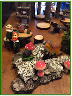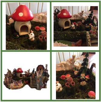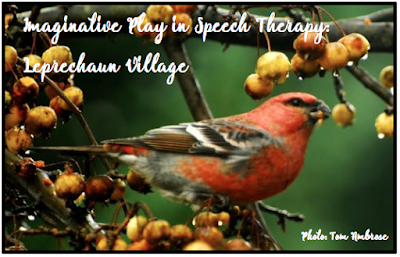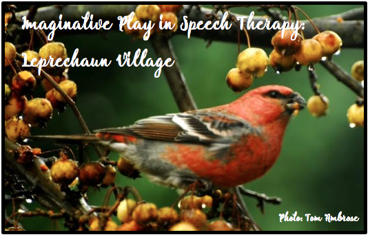 As I dreamed of flowers and bird song, I started planning therapy for my return to work. I have so many St. Patrick’s Day and spring activities, but I wanted something different. It’s important for me to stay motivated in speech therapy as well as my students. Our students are keenly aware of when we are bored, too! When my children were little they would engage in the most creative and imaginative play. They would have “set ups” with fairies and dragons and knights. I headed straight to the attic and dusted off the bins of fairies knowing the kids at school would love them. Imaginative play is immensely motivating as well as therapeutic. I decided to create a leprechaun and fairy village that can double later in the spring as a gnome village. Out into the bitter cold I went collecting mossy bark, sawing fungus off stumps and collecting branches. I thought my little fingers would freeze off!